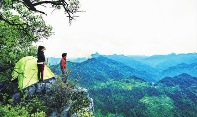 自駕或騎行至腳踏三省的汜水山山腰,5月的飛水寨里,十萬畝南竹散發著陣陣清香,竹香順著參天的古樹慢慢上爬,又隨著135米的飛水寨瀑布飛流直下,與山間潺潺的小溪一起沁入你的肌膚。徒步向上,你可以去挑戰下帳篷節的專用登山賽道。